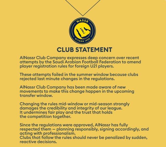 北京时间11月7日,沙特阿拉伯利雅得胜利俱乐部发表官方声明,反对沙特联赛21岁以下外援注册规则中期修改。目前,沙特联赛每支球队可注册10名外籍球员(其中2名21岁以下外籍球员),最多可参赛8名球员。此前,有俱乐部要求修改外籍球员注册规则,免除10名外籍球员的年龄限制。俱乐部声明:利雅得胜利足球俱乐部对沙特足协最近试图修改外国21岁以下球员的注册规则深表关注。这些尝试在夏季转会窗口期间失败了,因为俱乐部拒绝在最后一刻改变规则。利雅得胜利足球俱乐部正在关注新的发展,并将寻求在下一个转会窗口中促进这一变化。在转会窗口或赛季中期改变规则会严重损害可信度和联盟的诚信,破坏了支撑竞争的公平竞争和信任。自该条例获得批准以来,利雅得胜利完全遵守该条例,负责任地规划,相应地签约并专业地行事。遵守规则的俱乐部不应因突然的决定而受到惩罚。我们公开呼吁所有决策者保护沙特联盟的完整性,抵制任何符合其个人利益的压力。个别俱乐部不应优先考虑集体利益。考虑到本周围绕裁判的公众气氛(尽管利雅得的胜利受到一些处罚的影响),我们认为整个比赛都处于危险之中。沙特联盟是全球雄心和卓越的象征,并得到整个国家的支持。为了维持这一标准,所有决定都必须公平、透明并尊重比赛。利雅得胜利足球俱乐部保留采取必要行动的一切合法权利如果本赛季规则未经所有俱乐部批准而修改或实施,则须向体育机构通报。这严重违反了体育诚信和公平竞争的原则。 (演讲结束)